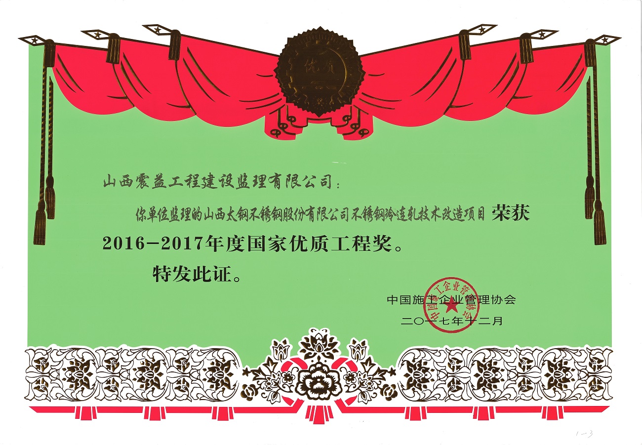 公司先后承擔(dān)了冶金、機(jī)械、電力、礦山、市政、環(huán)保、房屋建筑等工業(yè)及民用建設(shè)大中型工程項(xiàng)目1000余個(gè),足跡遍及國內(nèi)二十多個(gè)省市,在全國各地四千余個(gè)制造廠家進(jìn)行了駐廠設(shè)備監(jiān)理,工程監(jiān)理也立足省內(nèi)輻射全國多個(gè)省區(qū)乃至國外。多年來,我們憑著嚴(yán)格監(jiān)理、優(yōu)質(zhì)服務(wù)的工作作風(fēng)贏得業(yè)主的信任和好評,受監(jiān)工程質(zhì)量合格率均為100%。由我公司監(jiān)理的太鋼7.63m焦?fàn)t(及配套化產(chǎn))工程、450㎡燒結(jié)工程、4350m3高爐工程、400萬噸煉鋼/連鑄工程、2250mm熱軋工程、新不銹鋼冷軋工程、熱軋加熱爐工程、冶煉廢水處理工程、BOC制氧工程、40萬噸及50萬噸不銹鋼冷軋工程、制鐵煉鋼節(jié)能減排660㎡燒結(jié)機(jī)工程、不銹鋼冷軋光亮板結(jié)構(gòu)調(diào)整工程、型材系統(tǒng)改造一期徑鍛機(jī)工程、加工廠礦渣超細(xì)粉二期工程、2250mm熱連軋罩式爐工程、2250mm熱連軋新建鋼卷表面處理線工程、袁家村鐵礦項(xiàng)目、不銹冷連軋技術(shù)改造工程、硅鋼冷連軋技術(shù)改造工程等等多項(xiàng)工程項(xiàng)目均獲得了“冶金工業(yè)優(yōu)質(zhì)工程”獎;日貸清潔生產(chǎn)90噸電爐工程獲山西省“汾水杯”質(zhì)量獎;太原濱河小區(qū)、19宿舍、太鋼2*300MW自備電廠、太原市不銹鋼工業(yè)園區(qū)等工程獲太原市“******文明施工樣板”工地;太鋼不銹2*300MW自備電廠改擴(kuò)建煙筒構(gòu)筑物工程、太鋼2*300MW空冷供熱機(jī)組儲煤筒倉建筑工程、山西太鋼不銹鋼科技冷軋精密帶鋼工程等獲“山西省優(yōu)良工程”;1350 m3高爐、400萬噸煉鋼/連鑄工程獲得******建設(shè)工程“魯班”獎、不銹冷連軋技術(shù)改造工程獲“******優(yōu)質(zhì)工程獎”。太鋼150萬噸不銹鋼系統(tǒng)工程同時(shí)獲******“建國60年來經(jīng)典暨精品工程”獎、“******優(yōu)質(zhì)工程金質(zhì)獎”、******工程建設(shè)“魯班”獎三項(xiàng)大獎。